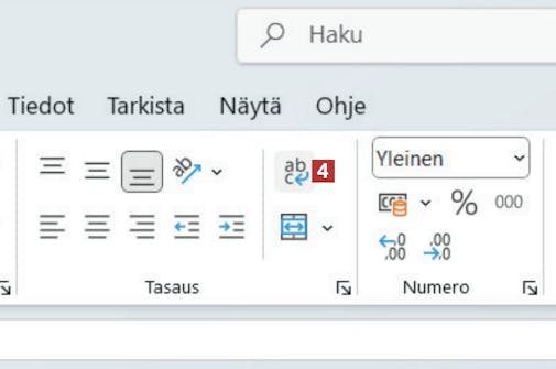 Minusta on turhauttavaa kirjoittaa tekstiä Excel-soluun. Kun haluan kirjoittaa tiettyyn soluun, teksti jatkuu solun ulkopuolelle viereisen sarakkeen päälle. Voisinko sen sijaan lisätä uuden rivin soluun, jotta teksti ei peitä laskentataulukon muita soluja?