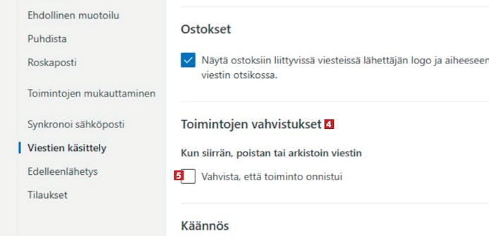Vieritä ikkunaa alas. Poista kohdassa Toimintojen vahvistukset 4 valintamerkki ruudusta Vahvista, että valinta onnistui 5.