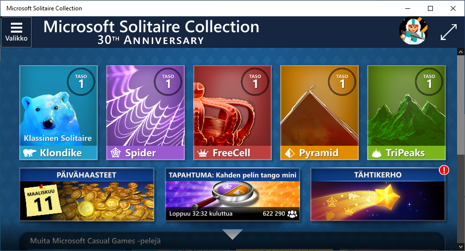 Jos Microsoftin pasianssiohjelmaa ei jostain syystä löydy laitteeltasi, niin siirry Microsoft Storeen tehtäväpalkin Kauppa-kuvakkeesta tai lataa Microsoft Solitaire Collection Microsoft Storesta valitsemalla oheinen Lataa pelipaketti -painike.