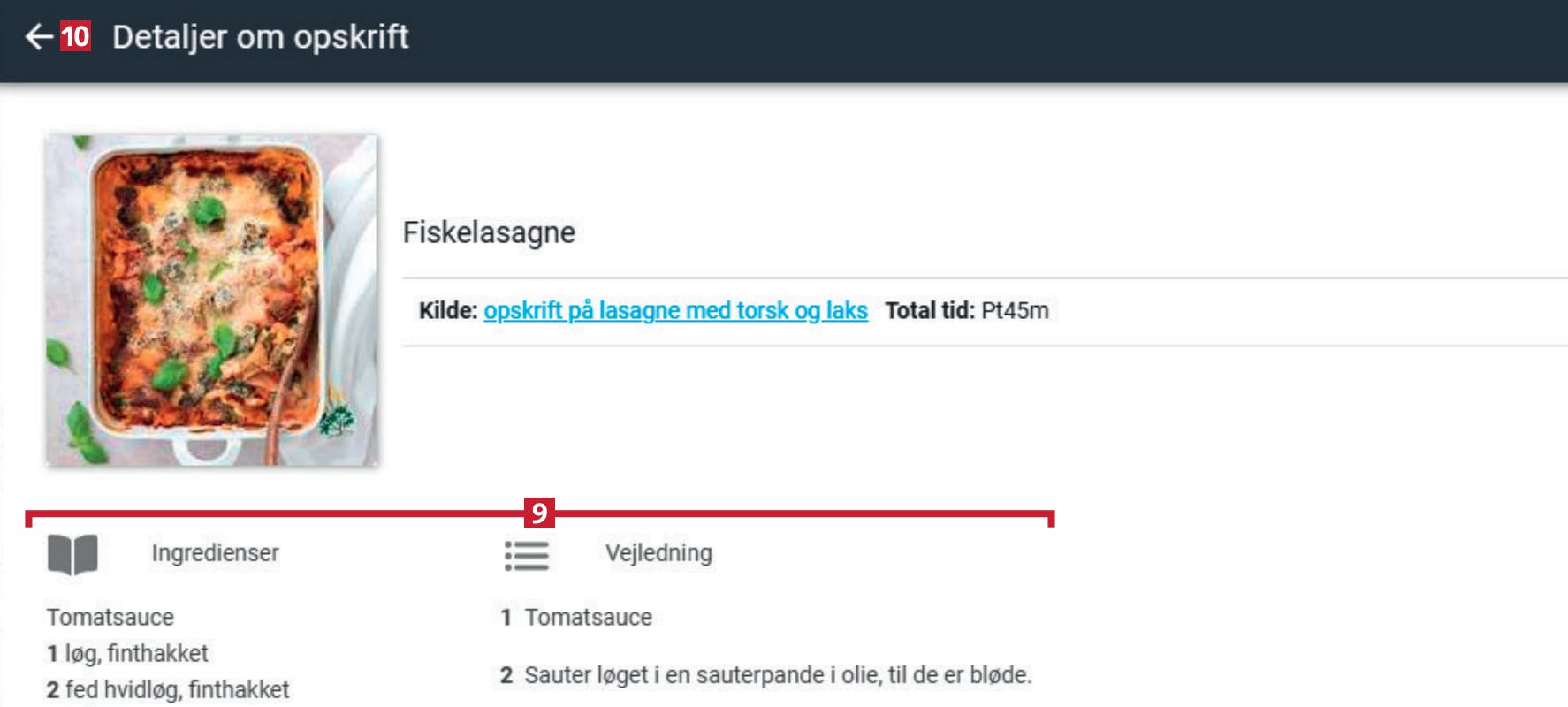 Verkkosivulta on tallennettu sekä luettelo raaka-aineista että ruuan valmistusohjeet 9. Palaa ohjelman päävalikkoon napsauttamalla vasemman yläreunan nuolta 10.
