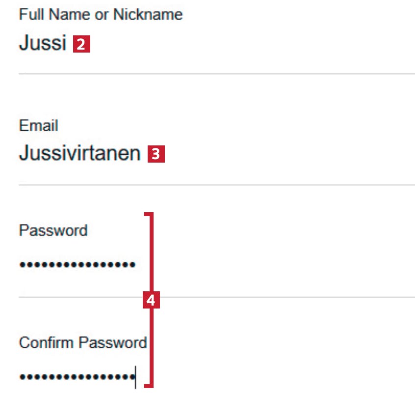 Kirjoita nimesi 2, sähköpostiosoitteesi 3 ja valitsemasi salasana 4. Et saa mainossähköposteja. Tili on luotava, jotta saat hankittua palvelintilaa resepteillesi.