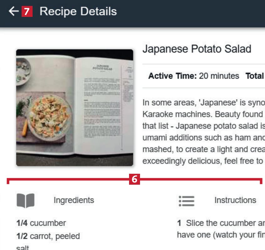 Kohdassa Titel 3 voit nimetä reseptin uudelleen. Kohdassa Description 4 voit kuvailla reseptiä, ja kohtaan Yield 5 voit merkitä, montako annosta reseptistä tulee.