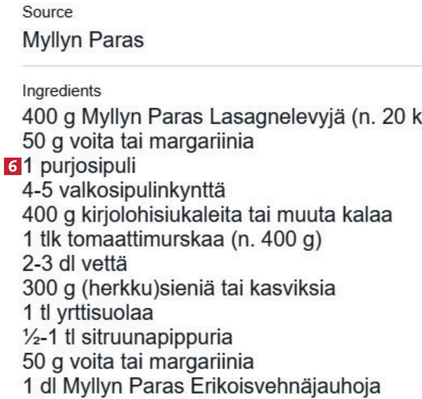 Voit muuttaa myös itse reseptiä napsauttamalla haluamaasi kohtaa, kuten raaka-ainelistaa 6. Poista vanhat tiedot ja kirjoita uudet tilalle.