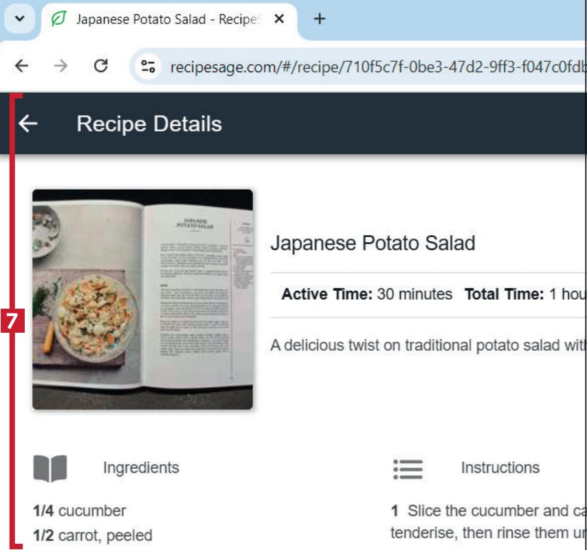 Voit jakaa sekä verkosta että kuvasta tallennettuja reseptejä. Avaa RecipeSage ja napsauta päävalikosta reseptiä 1, jonka haluat jakaa.