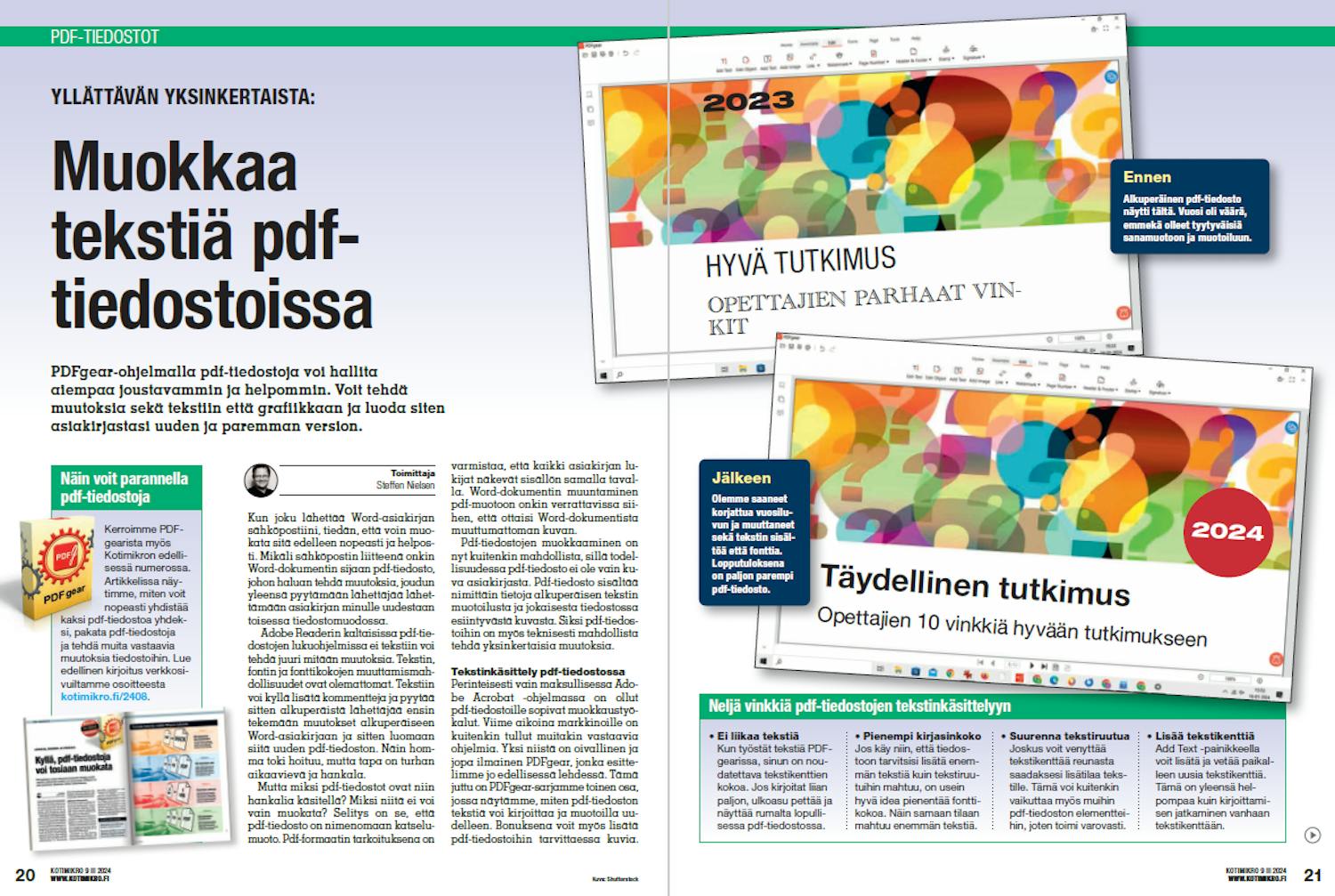 Formaattiin on tehty 32 vuodessa vain pieniä parannuksia. Huolimatta internetistä, älypuhelimista, sosiaalisesta mediasta, tekoälystä ja lukuisista muista tekniikan edistysaskelista vanha kunnon tiedostomuoto elää yhä ja voi vallan hyvin. Pdf on edelleen se muoto, johon muunnamme tiedostot, kun haluamme lähettää ne muille ilman riskiä ulkonäön tai sisällön muuttumisesta.