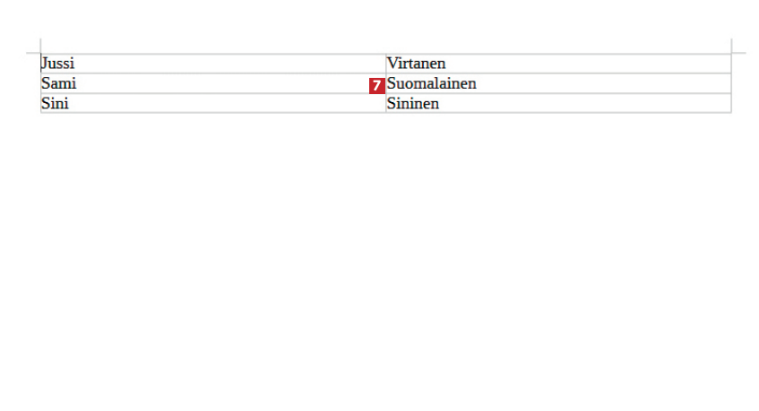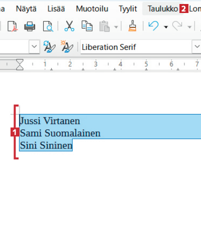 Tässä on kolme nimeä 1, jotka halutaan taulukkomuotoon siten, että etu- ja sukunimet ovat omissa sarakkeissaan. Valitse Taulukko 2.