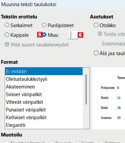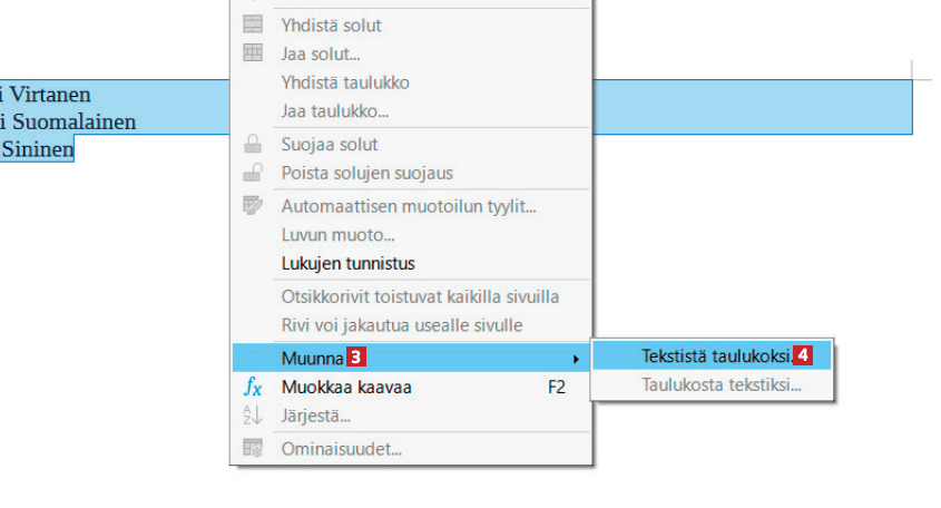 Valitse ensin avautuvasta valikosta valikon kohta Muunna 3 ja seuraavaksi kohta Tekstistä taulukoksi... 4.