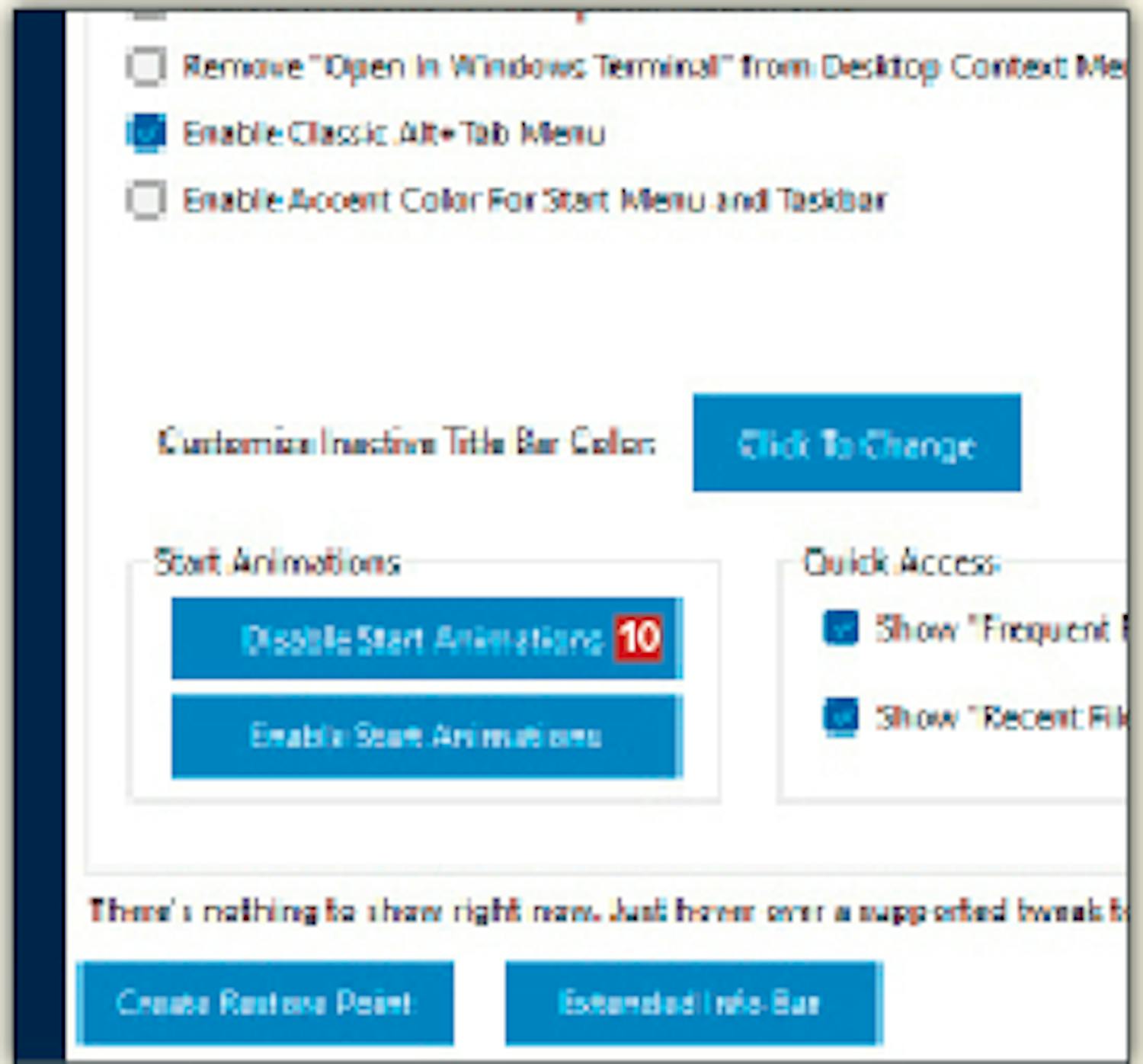 Ultimate Windows Tweakerillä pääsee käsiksi sellaisiinkin Windowsin tehtäväpalkin asetuksiin, joita ei ole aikaisemmin voinut muokata. Asetuksissa voi esimerkiksi muuttaa kuvakkeiden kokoa ja määrittää, onko aloitusvalikko tehtäväpalkin vasemmassa vai oikeassa reunassa vai keskellä. Lisäksi kohdevalikkoon voi lisätä käteviä pikavalintoja.