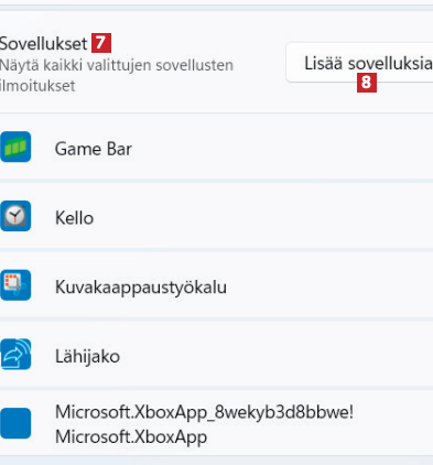 Kohdasta Sovellukset 7 voit valita sovellukset, jotka saavat lähettää ilmoituksia. Napsauta kohtaa Lisää sovelluksia 8 lisätäksesi ohjelman tai sovelluksen luettelosta.