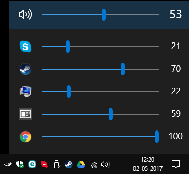 Yllä olevassa kuvassa on säädetty Skypen äänenvoimakkuutta vähän pienemmälle, ja Chromen äänenvoimakkuus on laitettu täysille.