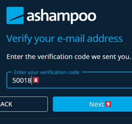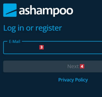 Rekisteröidy nyt Ashampoo-palveluun syöttämällä sähköpostiosoitteesi 3 ja valitsemalla Next 4. Jos olet jo rekisteröitynyt, kirjaudu sisään käyttäjätililläsi.