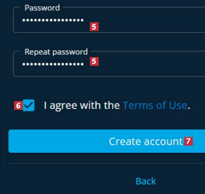 Syötä valitsemasi salasana 5, lisää sitten valintamerkki kohtaan I agree with the... 6 ja napsauta vielä painiketta Create account 7.