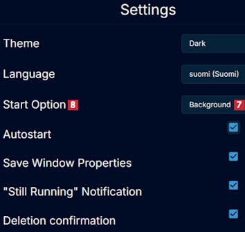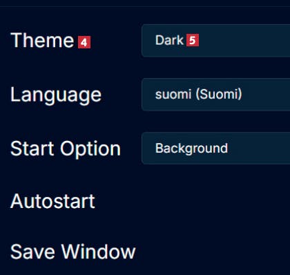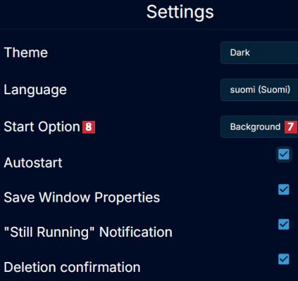 Suosittelemme ohjelman käynnistyvän ja toimivan taustalla. Tee se valitsemalla Background 7 kohdassa Start Option 8. Sitten ohjelma on aina käyttövalmis.