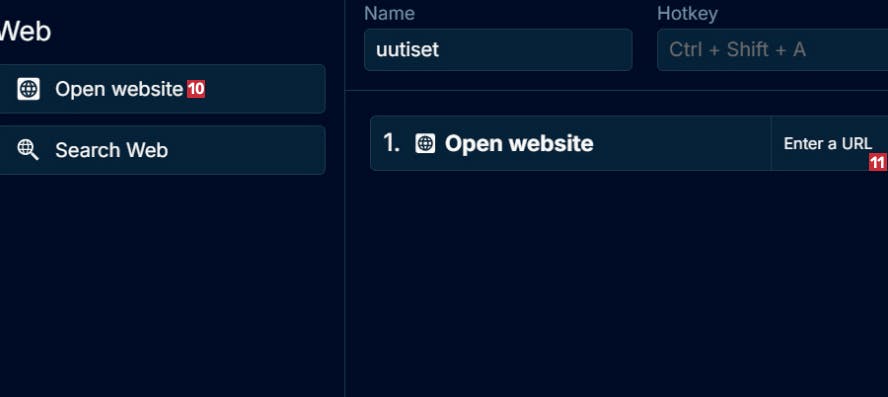 Voit antaa pikakuvakkeelle nimen ylälaidassa kohdassa Name 7. Kutsumme sitä tässä nimellä uutiset 8. Voit muuttaa valittuja näppäimiä pikanäppäimen vieressä. Saman voit toki tehdä halutessasi myös myöhemmin.