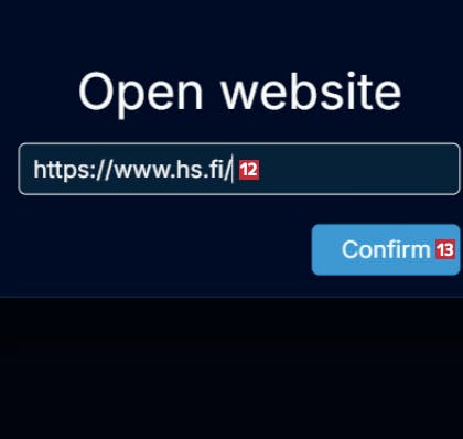 Syötämme seuraavaksi osoitteen www.hs.fi/) 12, mutta se voi tietysti olla mikä tahansa muukin verkkosivusto. Valitse Confirm 13.