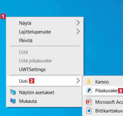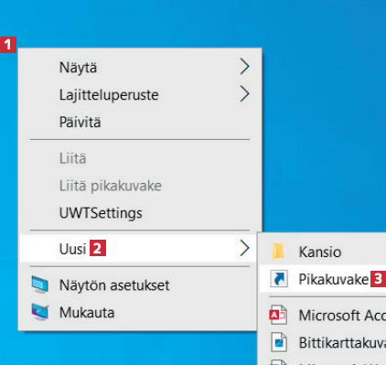 Jos haluat tehdä pikakuvakkeen ohjelmallesi, napsauta hiiren kakkospainikkeella työpöytää 1 ja vie hiiri kohtaan Uusi 2. Valitse seuraavaksi valikosta Pikakuvake 3.