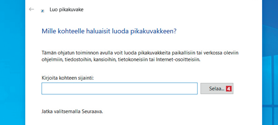 Sitten aukeaa opastettu toiminto. Napsauta Selaa... 4 valitaksesi ohjelman, jolle haluat pikakuvakkeen.