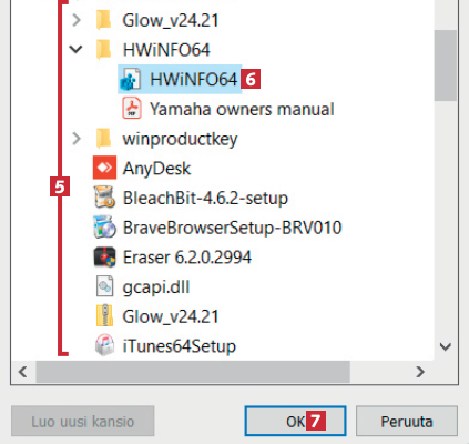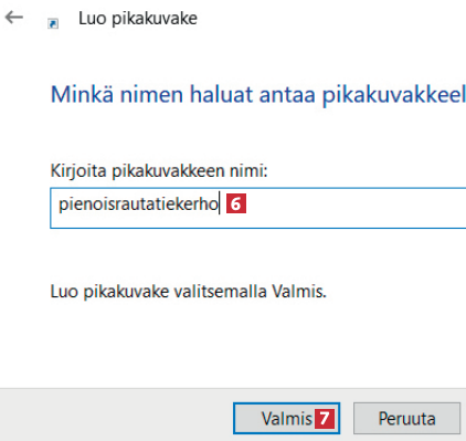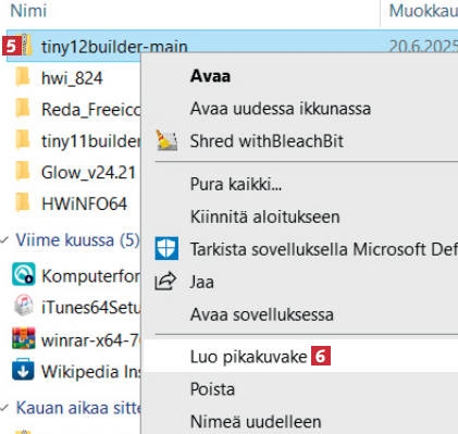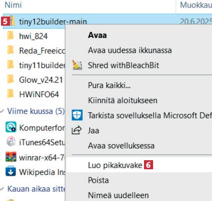 Voit luoda pikakuvakkeen tiedostoon samalla tavalla. Napsauta tiedostoa hiiren kakkospainikkeella 5 ja valitse Luo pikakuvake 6.