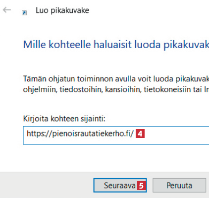 Napsautus avaa oppaan. Kirjoita nyt verkkosivun osoite 4, jolle haluat luoda pikakuvakkeen. Napsauta sitten painiketta Seuraava 5.