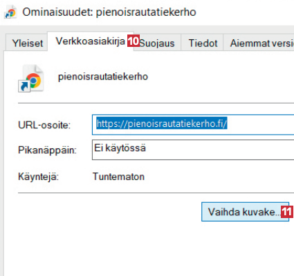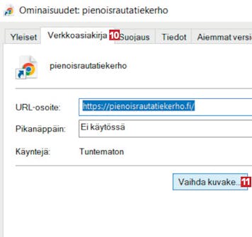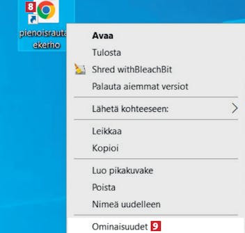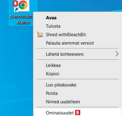 Pikakuvake on valmis. Kuvakkeena on selaimesi ikoni. Voit vaihtaa sen: napsauta uutta pikakuvaketta 8 hiiren kakkospainikkeella ja valitse sitten Ominaisuudet 9.