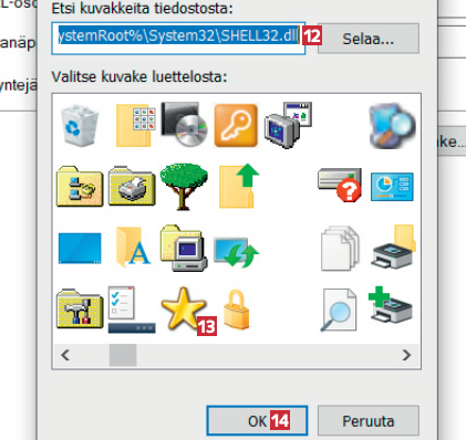 Kirjoita osoiteriville 12 %SystemRoot%\System32\ SHELL32.dll ja paina Enter-näppäintä. Valitse sopiva ikoni 13 ja sitten OK 14. Valitse uudelleen OK.