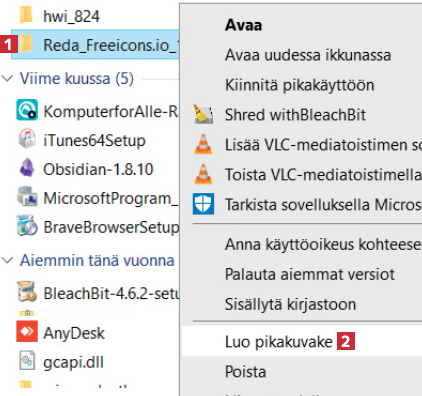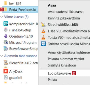Napsauta hiiren kakkospainikkeella kansiota 1, jolle haluat luoda pikakuvakkeen. Valitse sitten Luo pikakuvake 2.