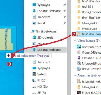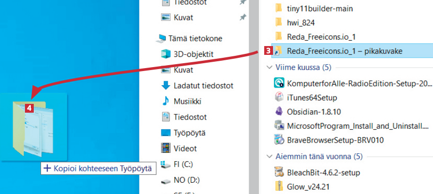 Pikakuvake on heti valmiina kansion alapuolella. Sen tunnistaa pienestä nuolesta kuvakkeessa. Raahaa nyt pikakuvake 3 Resurssienhallinnasta työpöydälle 4.