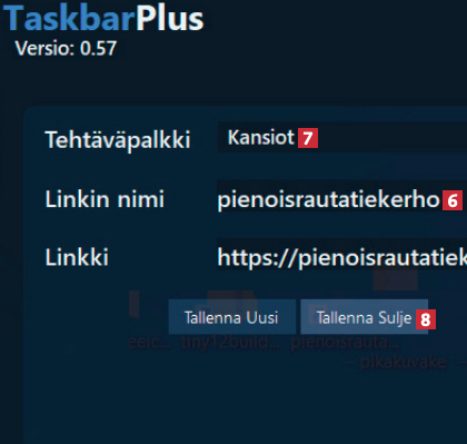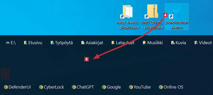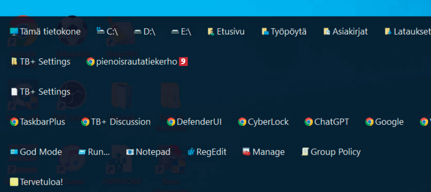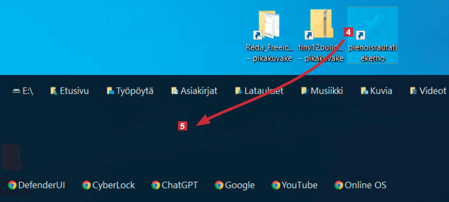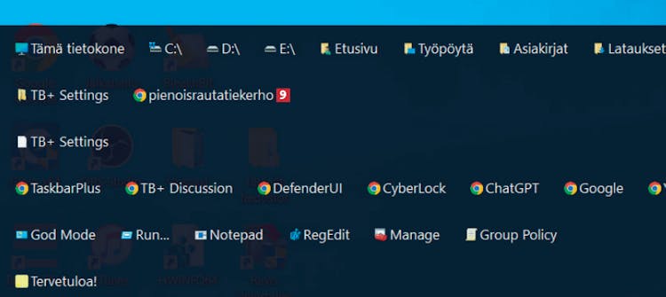 TaskbarPlus laatii työpöydän alaosaan pikakuvakepaneelin, jossa on joukko kiinteitä pikakuvakkeita. Voit lisätä omia pikakuvakkeita vetämällä ne 4 työpöydältä TaskbarPlus-ikkunaan 5.