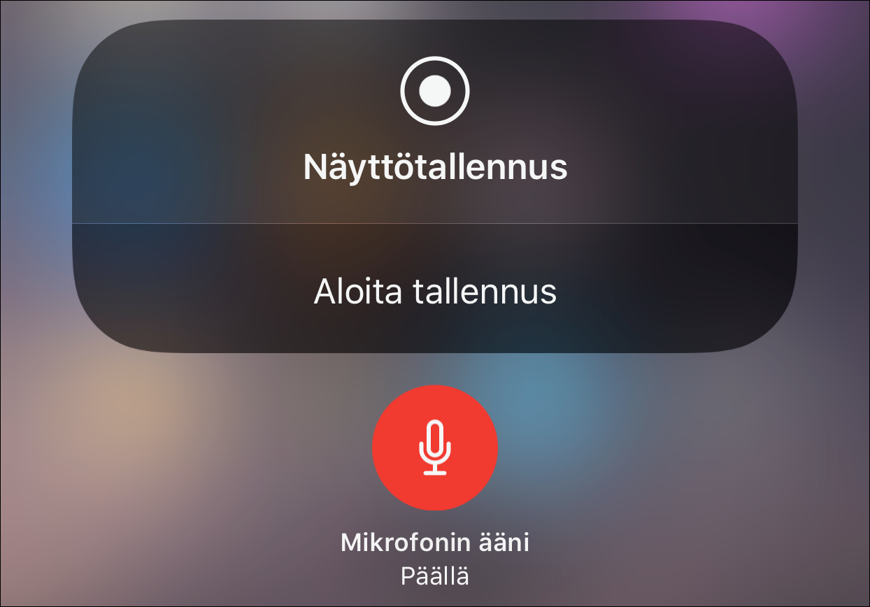 Kun haluat tallentaa videota, pyyhkäise Ohjauskeskus esiin näytön alareunasta. Jos haluat videoon äänen, paina pitkään Ohjauskeskukseen ilmestynyttä tallennuspainiketta ja valitse mikrofonin kuva.