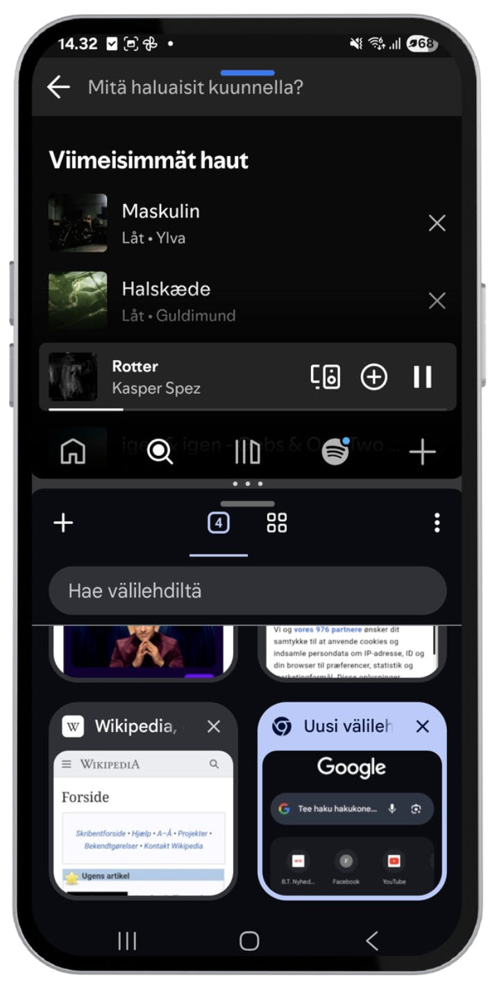 Androidissa on mahdollisuus käyttää kahta sovellusta yhtä aikaa jaetulla näytöllä. Voit siis pitää sähköpostisi auki yhdellä puolen näyttöä ja vaikkapa selaimen tai valokuvasi auki toisella.