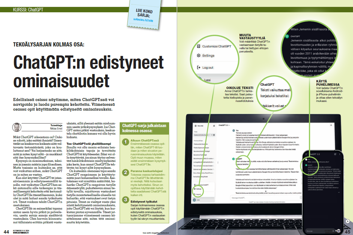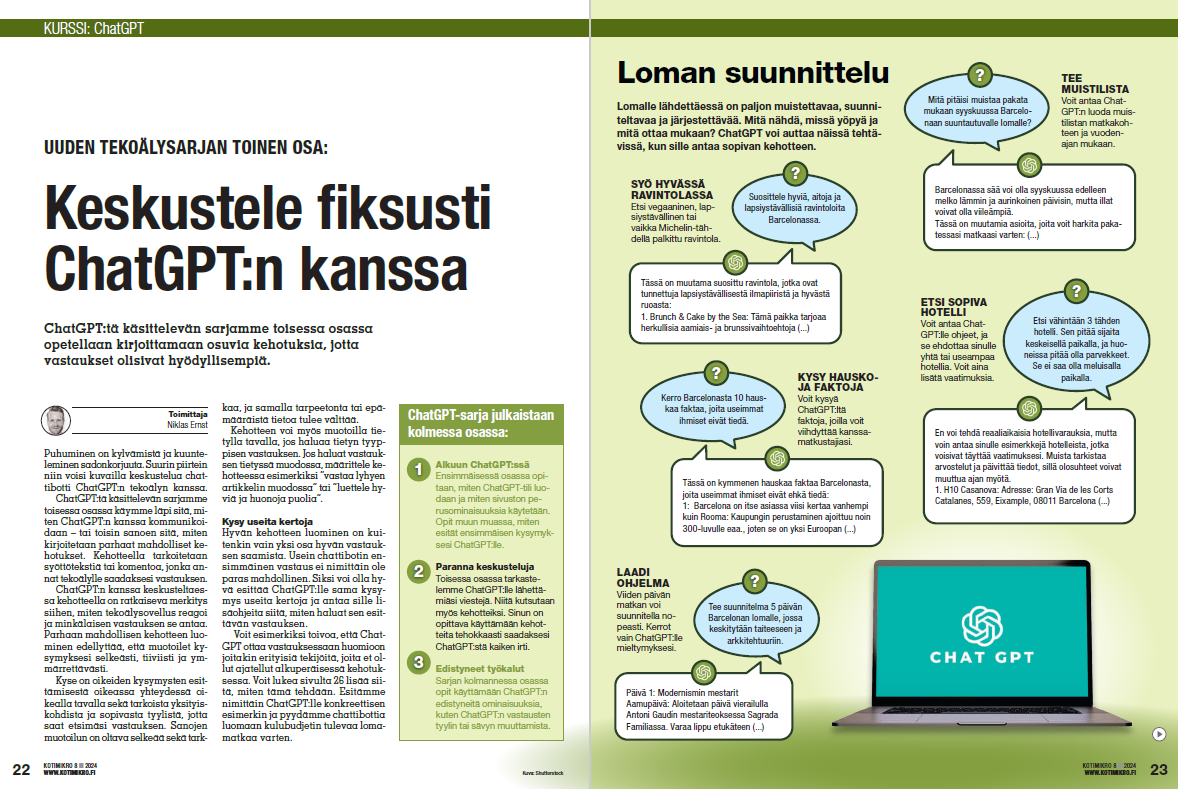 Tämä tekee tästä artikkelisarjasta hyödyllisen sekä niille, jotka eivät ole koskaan aiemmin käyttäneet Chat- GPT:tä, että niille, jotka ovat jo aloittaneet työkalun käytön ja haluavat lisää tietoa siitä, mihin kaikkeen sitä voidaan käyttää. Kurssi on jaettu kolmeen osaan. Voit lukea niistä lisää oikealla olevasta tiivistelmästä. Pidä hauskaa!