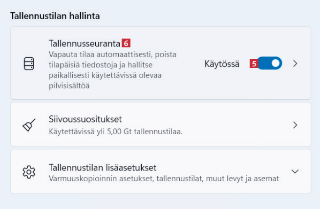 Napsauta ensin liukusäädin 5 käyttöön eli siniseksi ja sitten jotain kohtaa Tallennusseuranta-kentässä 6.