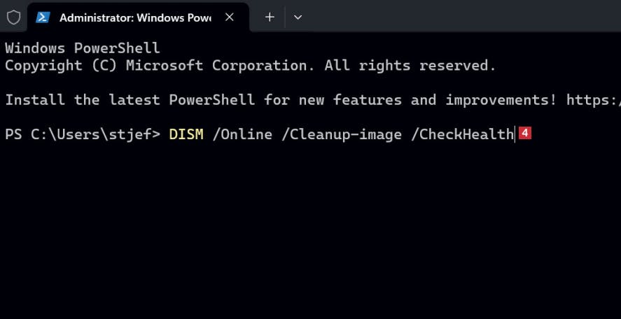 Kirjoita DISM /Online /Cleanup-Image /CheckHealth 4 (jokaisen kauttaviivan eteen tulee välilyönti) ja paina Enter-näppäintä. Odota, kunnes skannaus on valmis.