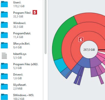 Vasemmassa reunassa on luettelo kansioista 5 ja oikealla kuvaaja kovalevyn tallennustilasta. Napsauta sisintä punaista sektoria 6 päästäksesi käsiksi suurimpiin tiedostoihin.