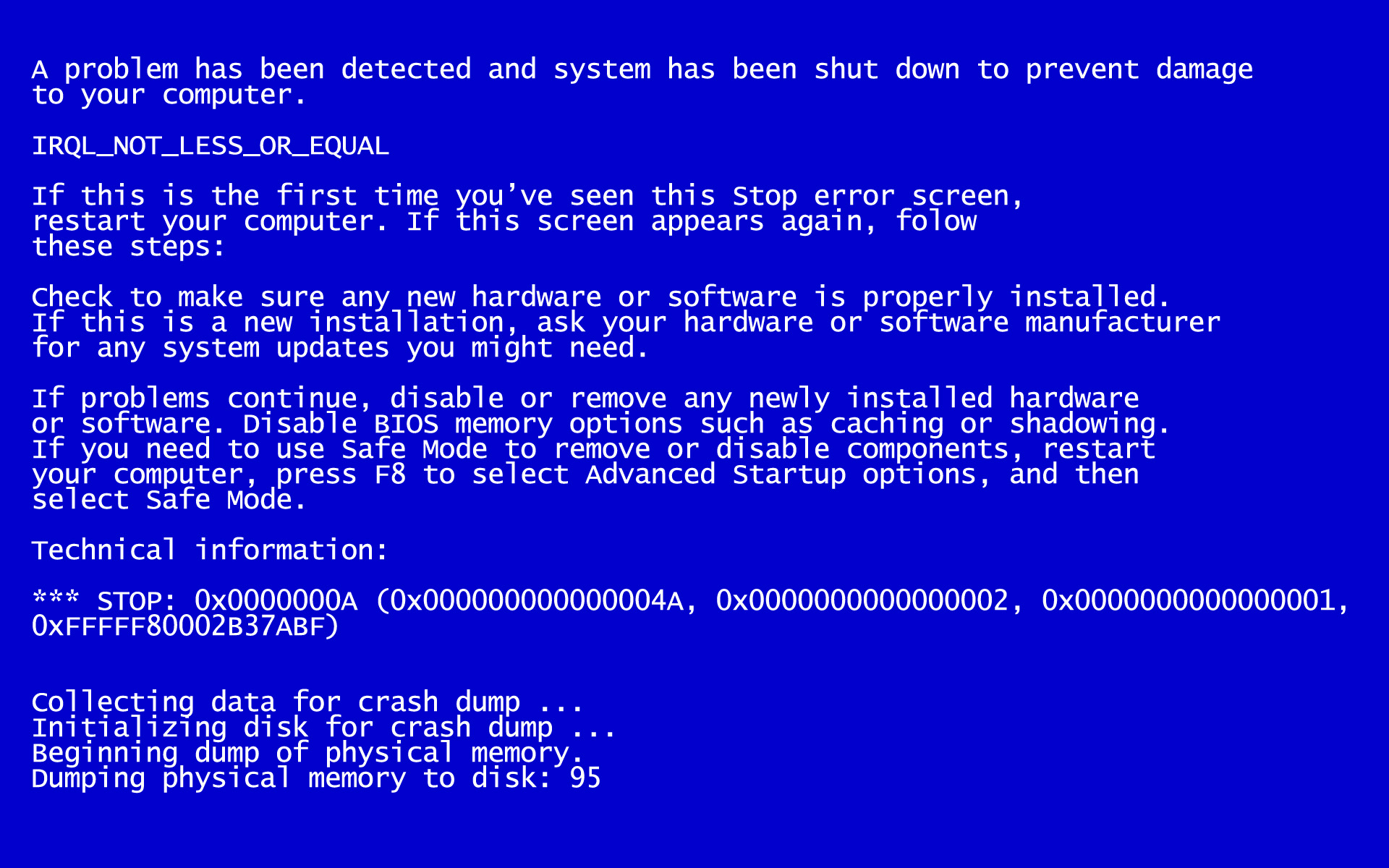 Windowsissa havaittu haavoittuvuus mahdollistaa mielivaltaisen koodin suorittamisen, joka pysäyttää laitteen siniseen virhenäyttöön, josta käytetään englanniksi nimitystä blue screen of death, "sininen kuolemanruutu".