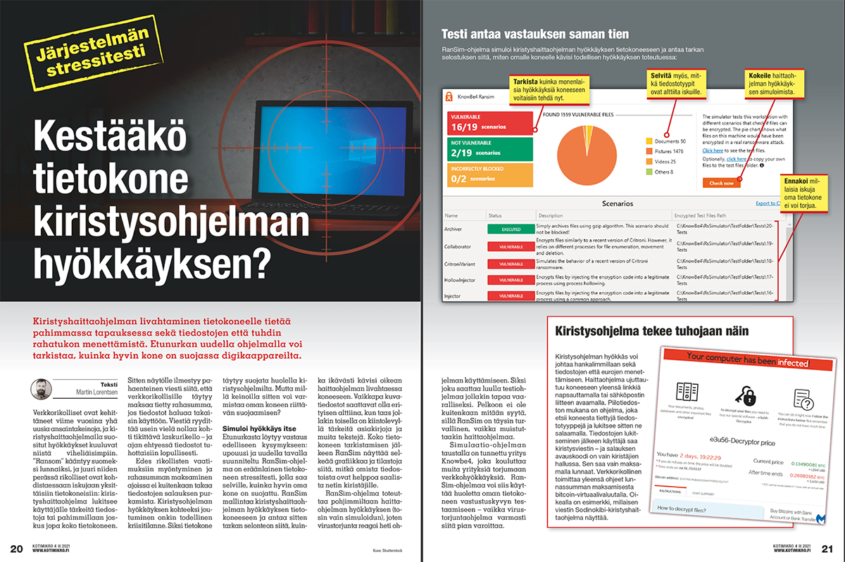 RanSimin asentamisen ja virustorjunnan asetusten määrittämisen jälkeen voi simuloida kiristysohjelman hyökkäyksen tietokoneeseen. Se on helppoa: tee vain tarkistuskierros, niin saat sen tuloksen luettelon tietokoneen