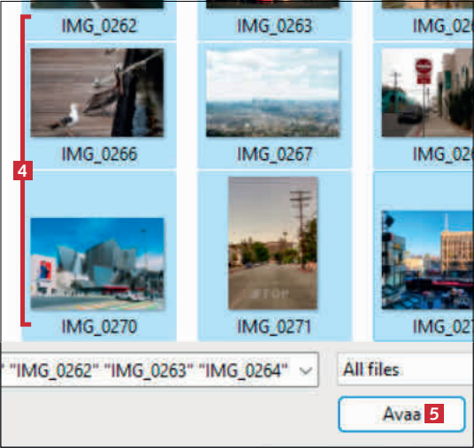 Siirry kansioon, jossa suojattavat tiedostot ovat. Valitse suojattavat tiedostot pitämällä CTRL-painiketta pohjassa ja napsauttamalla tiedostoja hiirellä 4. Valitse sitten Avaa 5.