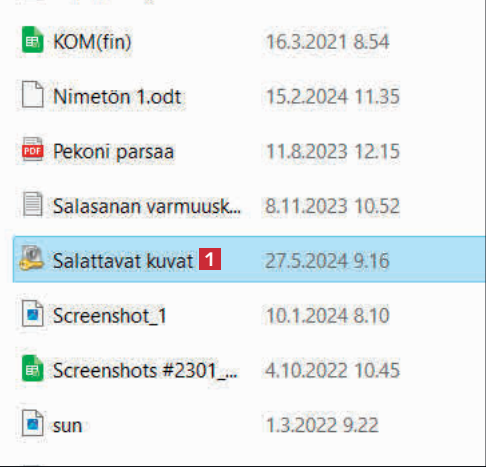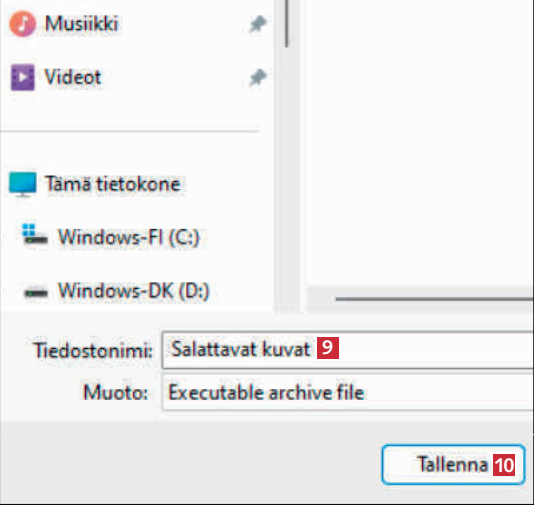 Valitse kansio, johon haluat tallentaa salatun tiedoston. Anna sille nimi 9 ja valitse Tallenna 10.