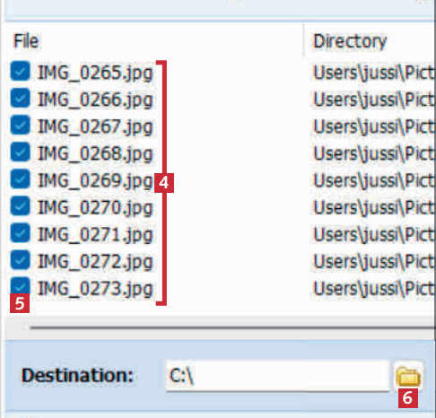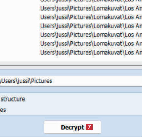 Näet nyt salatun sisällön 4. Rastita tiedostot, jotka haluat purkaa 5. Napsauta kansiokuvaketta 6 ja valitse kansio, johon haluat tallentaa tiedoston.