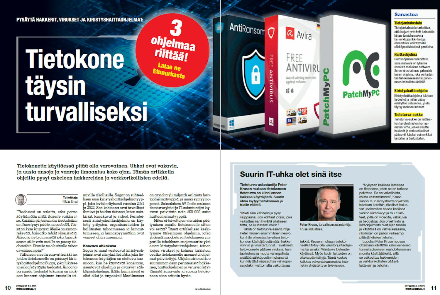 Miten ei-toivottujen vieraiden päätymisen omalle tietokoneelle sitten voi estää? Tässä artikkelissa keskitymme tärkeimpiin ohjelmiin, jotka yhdessä muodostavat tietokoneen ympärille tehokkaan suojamuurin: yksi estää kiristyshaittaohjelmat, toinen torjuu virukset ja kolmas tarkistaa, ovatko tietokoneelle asennetut ohjelmat päivitettyjä. Ohjelmatrio sulkee suurimman osan perinteisistä hakkerien, haittaohjelmien ja virusten käyttämistä kanavista ja suojaa tietokoneen siten erittäin hyvin.