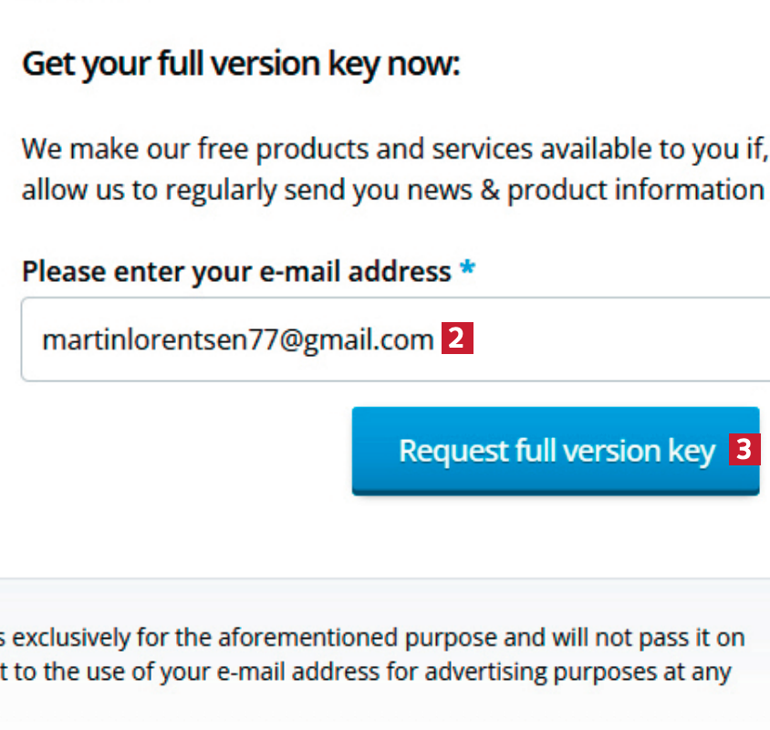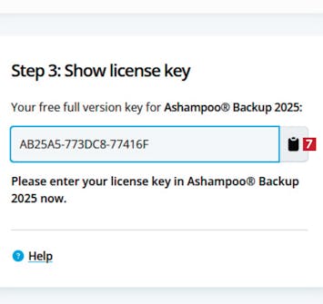 Voit saada Ashampoo Backup 2025:n täysversion lataamalla ilmaisen lisenssiavaimen. Se vaatii vain sähköpostiosoitteen. Toimi näin: