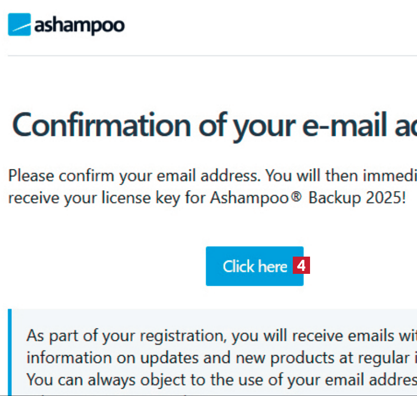 Avaa antamaasi sähköpostiosoitteeseen saapunut Ashampoon viesti. Napsauta viestissä olevaa Click here 4 -linkkiä.