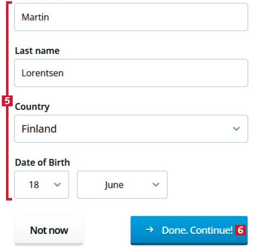 Syötä tietosi näkyviin kenttiin 5. Sinun ei tarvitse antaa oikeita tietojasi, jos et halua jakaa niitä. Valitse sitten Done. Continue! 6.