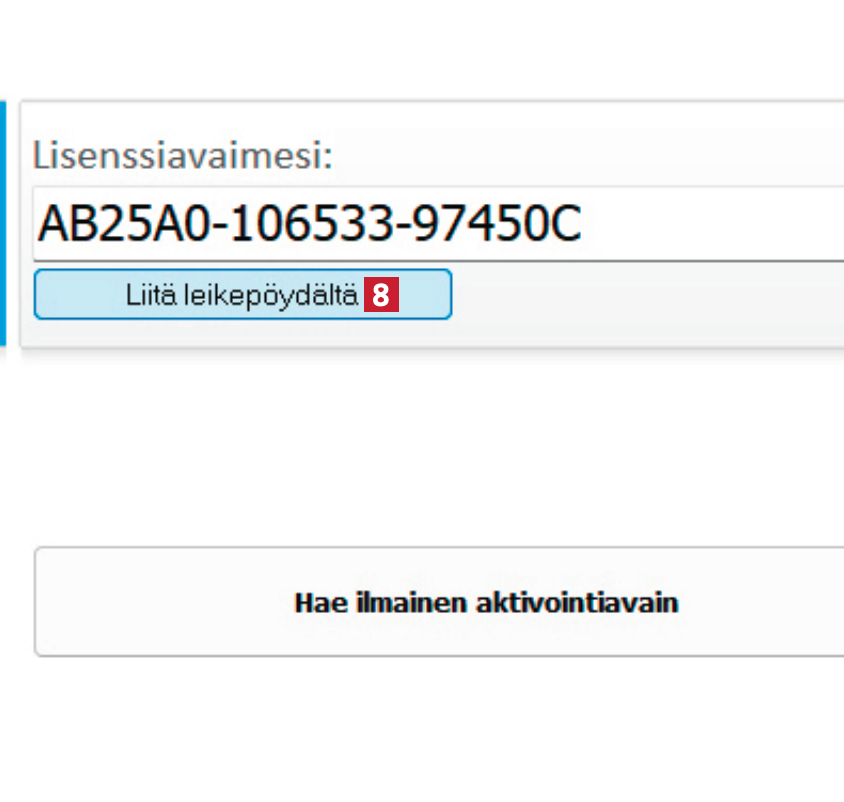 Palaa ohjelmaan ja valitse Liitä leikepöydältä 8, jolloin koodi liitetään. Napsauta sitten aktivointikoodin oikealla puolella olevaa Aktivoi nyt! -painiketta.