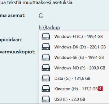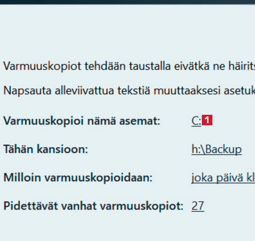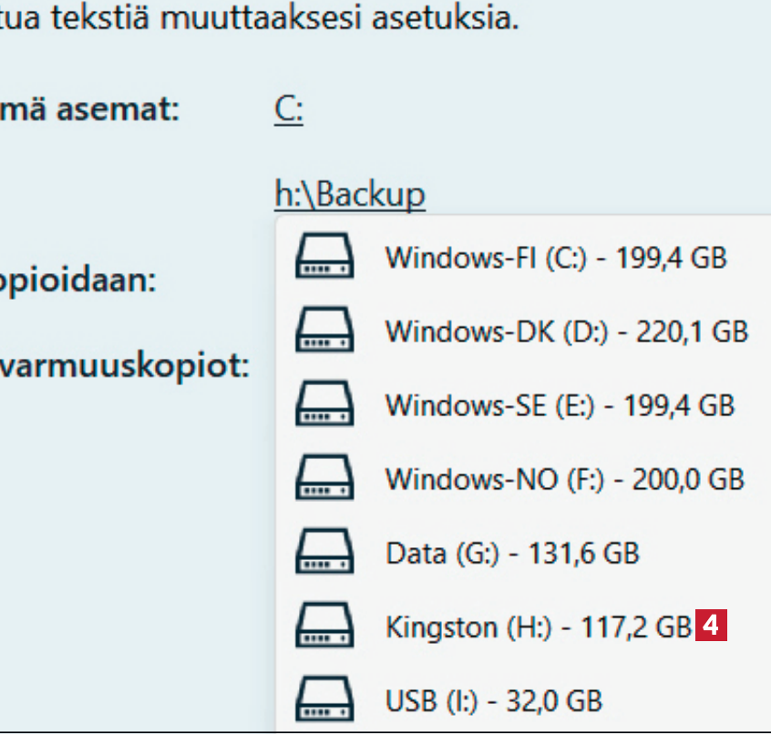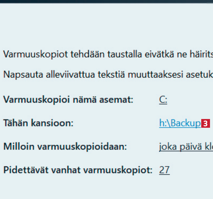 Napsauta Tähän kansioon -kohdan vieressä olevaa alleviivattua tekstiä 3. Tässä voit valita tiedostojen varmuuskopion sijainnin.