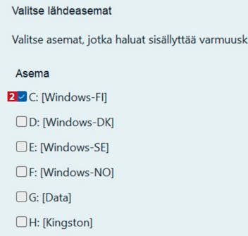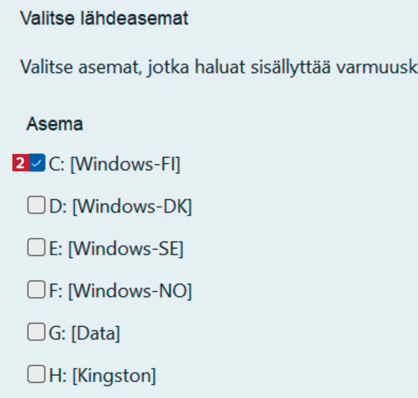 Aloita liittämällä ulkoinen kiintolevy tai USB-muistitikku tietokoneeseen ja avaamalla Ashampoo Backup 2025. Napsauta kohtaa Varmuuskopioi nämä asemat 1.