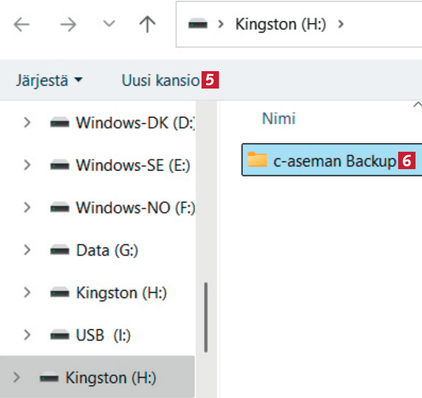 Varmuuskopioasema toimii kuten muutkin kansiot ja asemat Resurssienhallinnassa, ja se aukeaa kaksoisnapsauttamalla sitä 7.