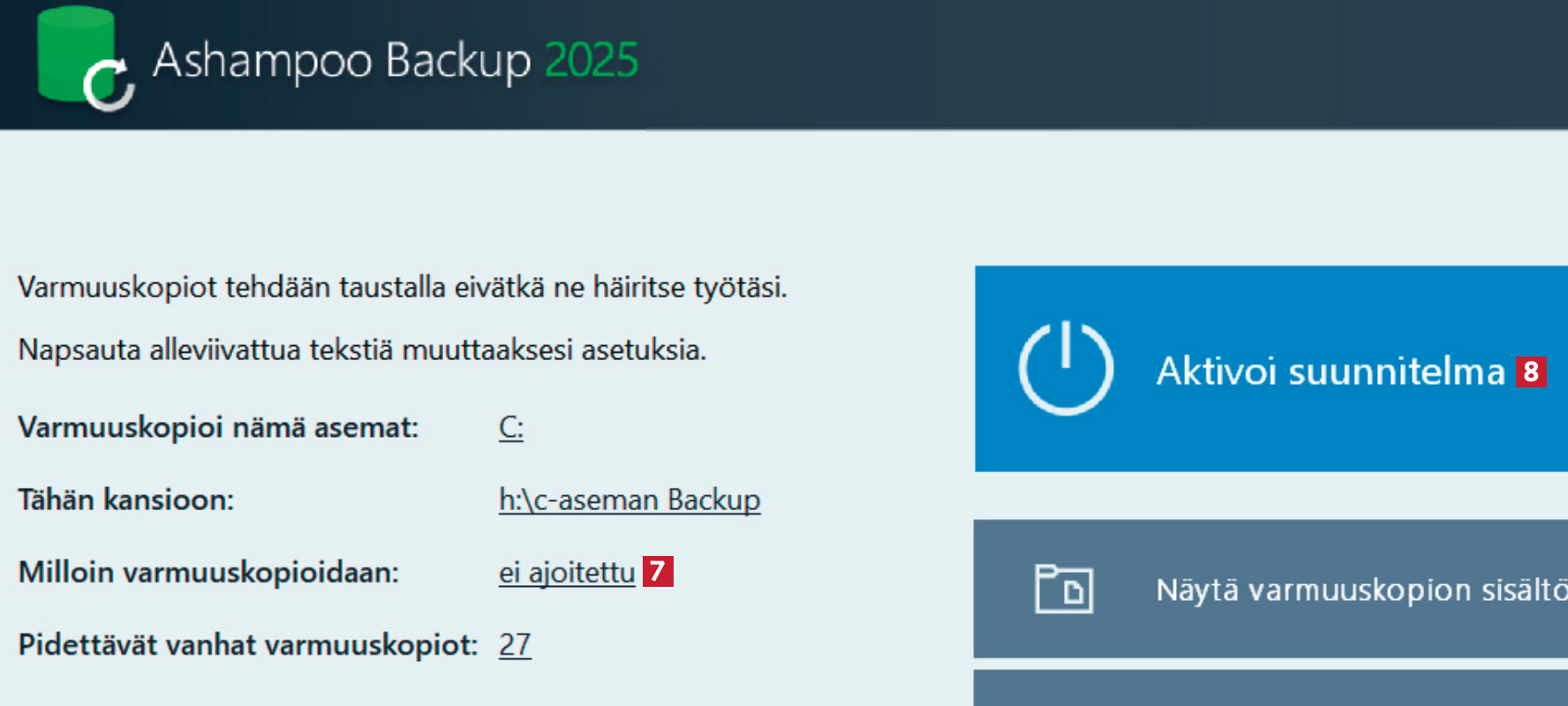 Voit määrittää lisää asetuksia, kuten varmuuskopioinnin toistumistiheyden 7, mutta sitä ei tarvitse tehdä nyt. Valitse sen sijaan Aktivoi suunnitelma 8.