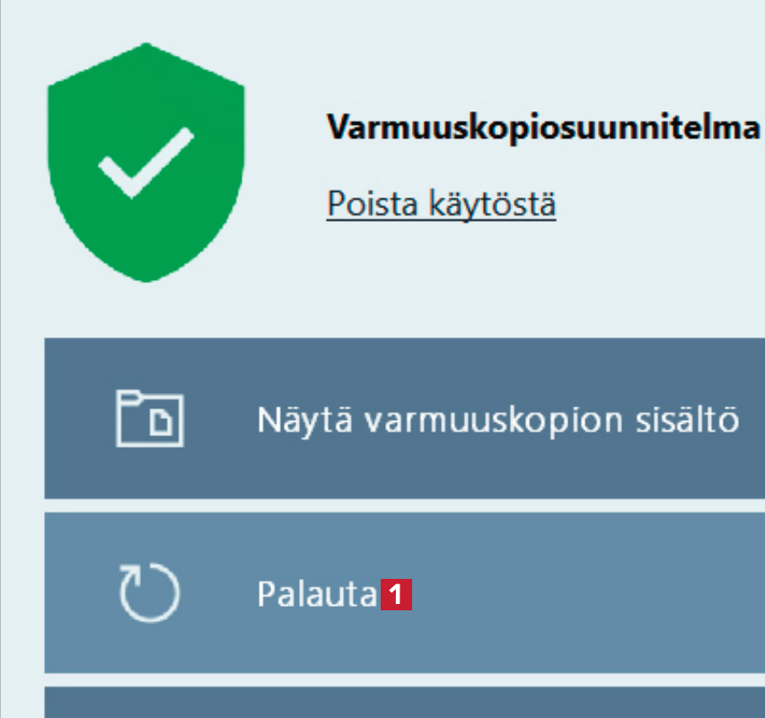 Aloita liittämällä varmuuskopion sisältävä ulkoinen kiintolevy tai usb-muistitikku tietokoneeseen. Avaa sitten Ashampoo Backup 2025 ja napsauta kohtaa Palauta 1.