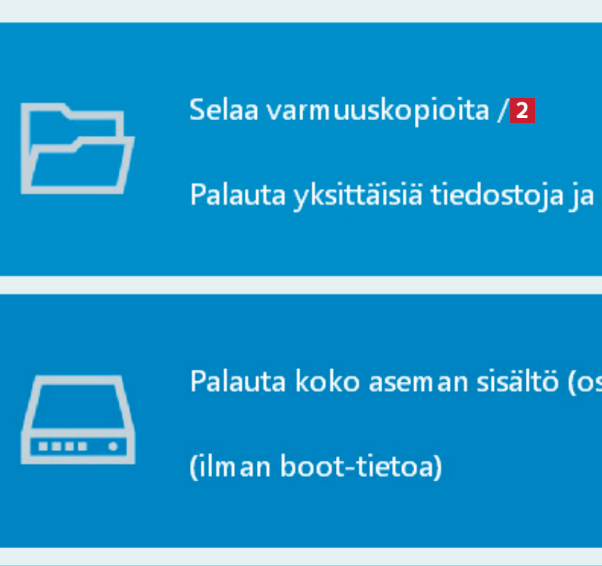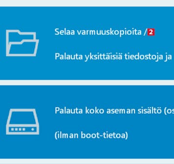 Voit palauttaa koko C-aseman kerralla tai palauttaa yksittäisiä tiedostoja tai kansioita. Nyt palautamme vain joitakin tiedostoja. Valitse Selaa varmuuskopioita 2.